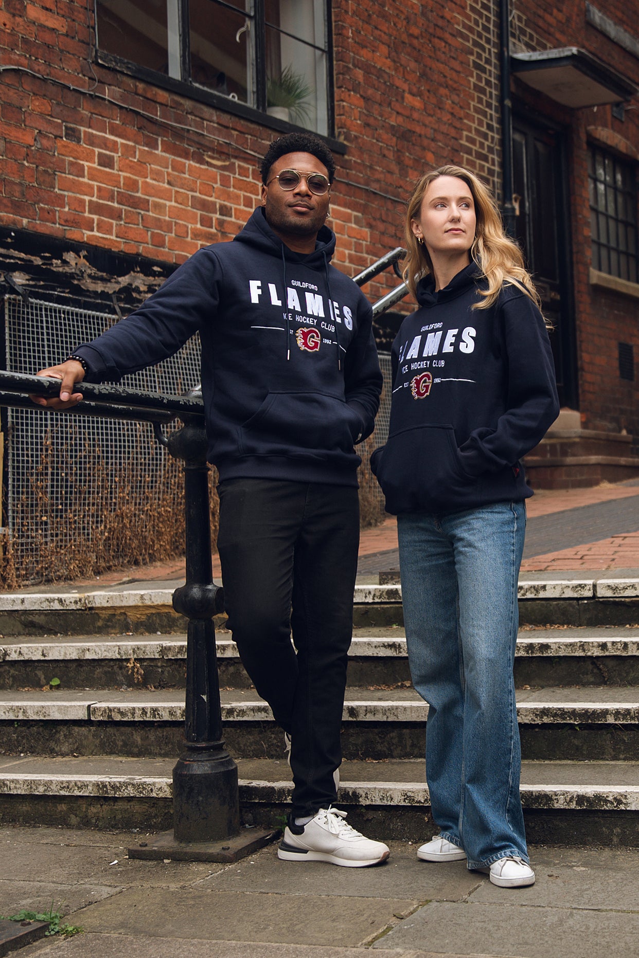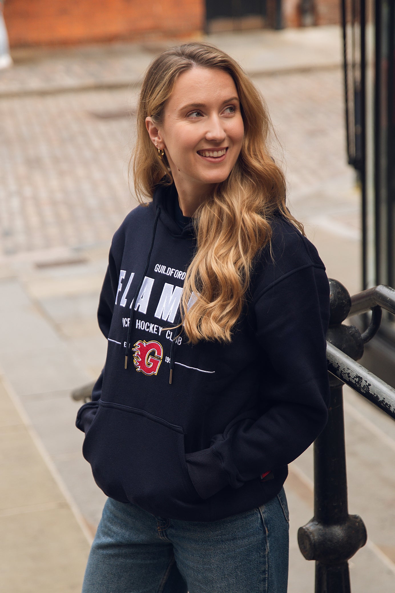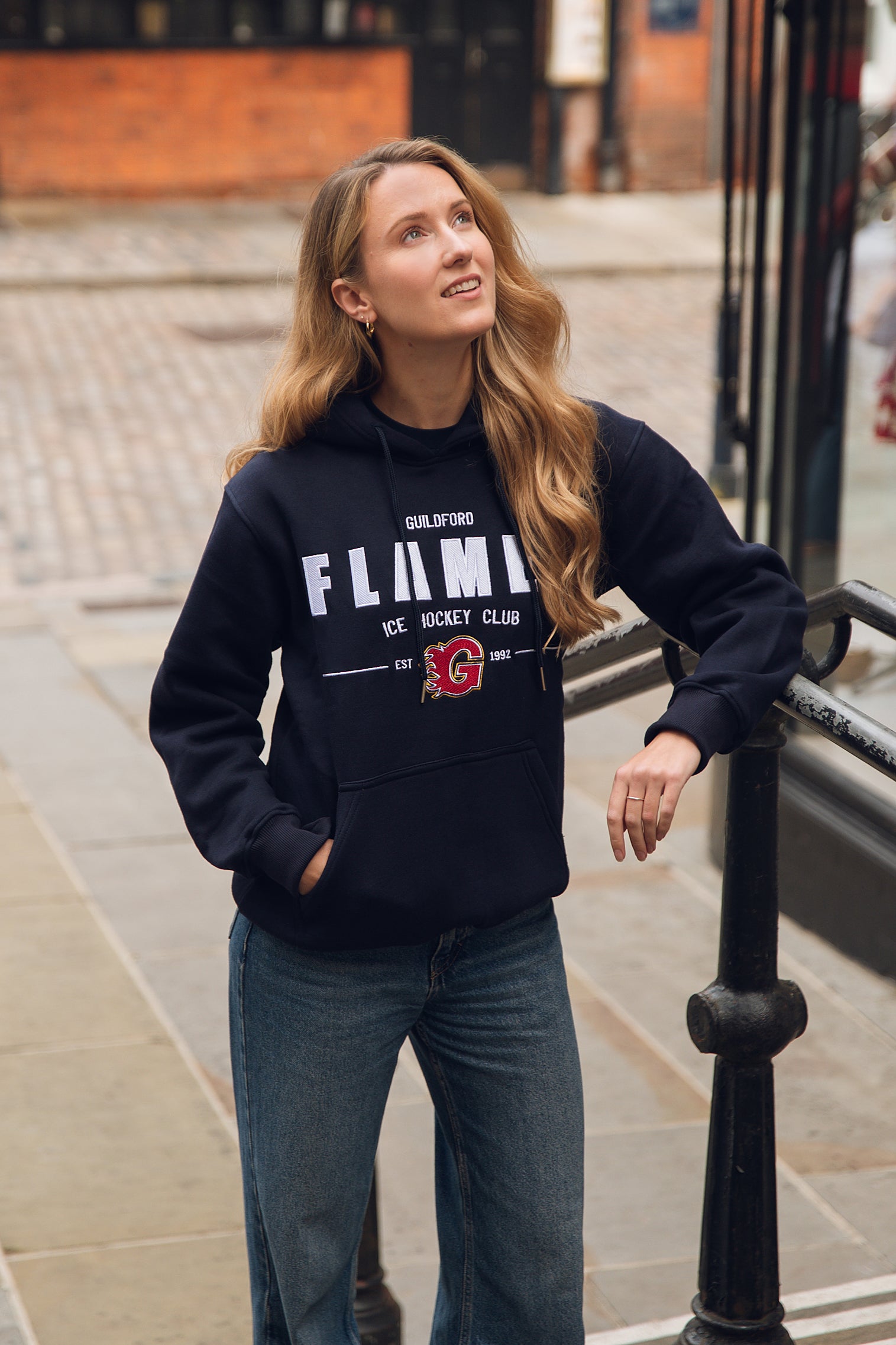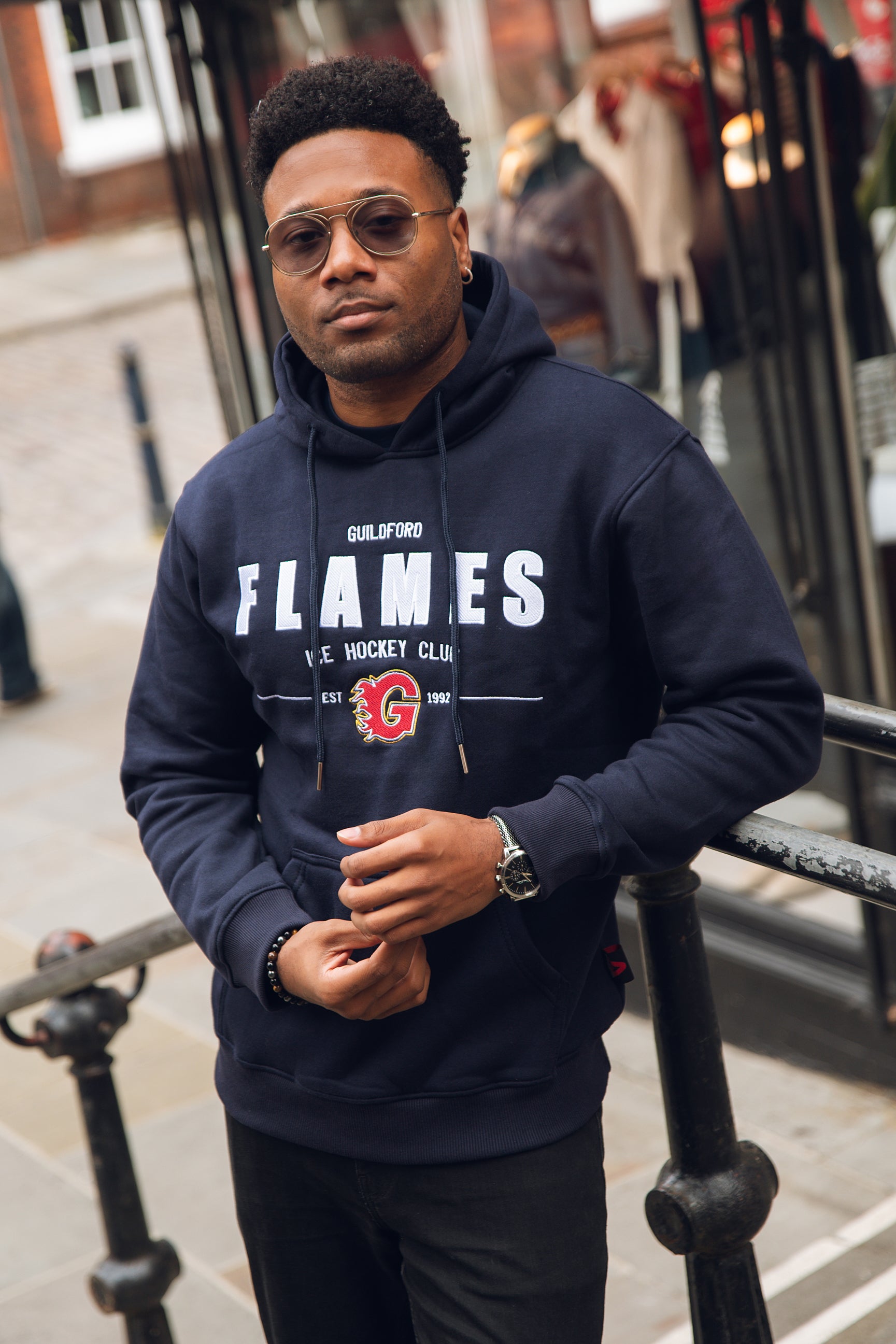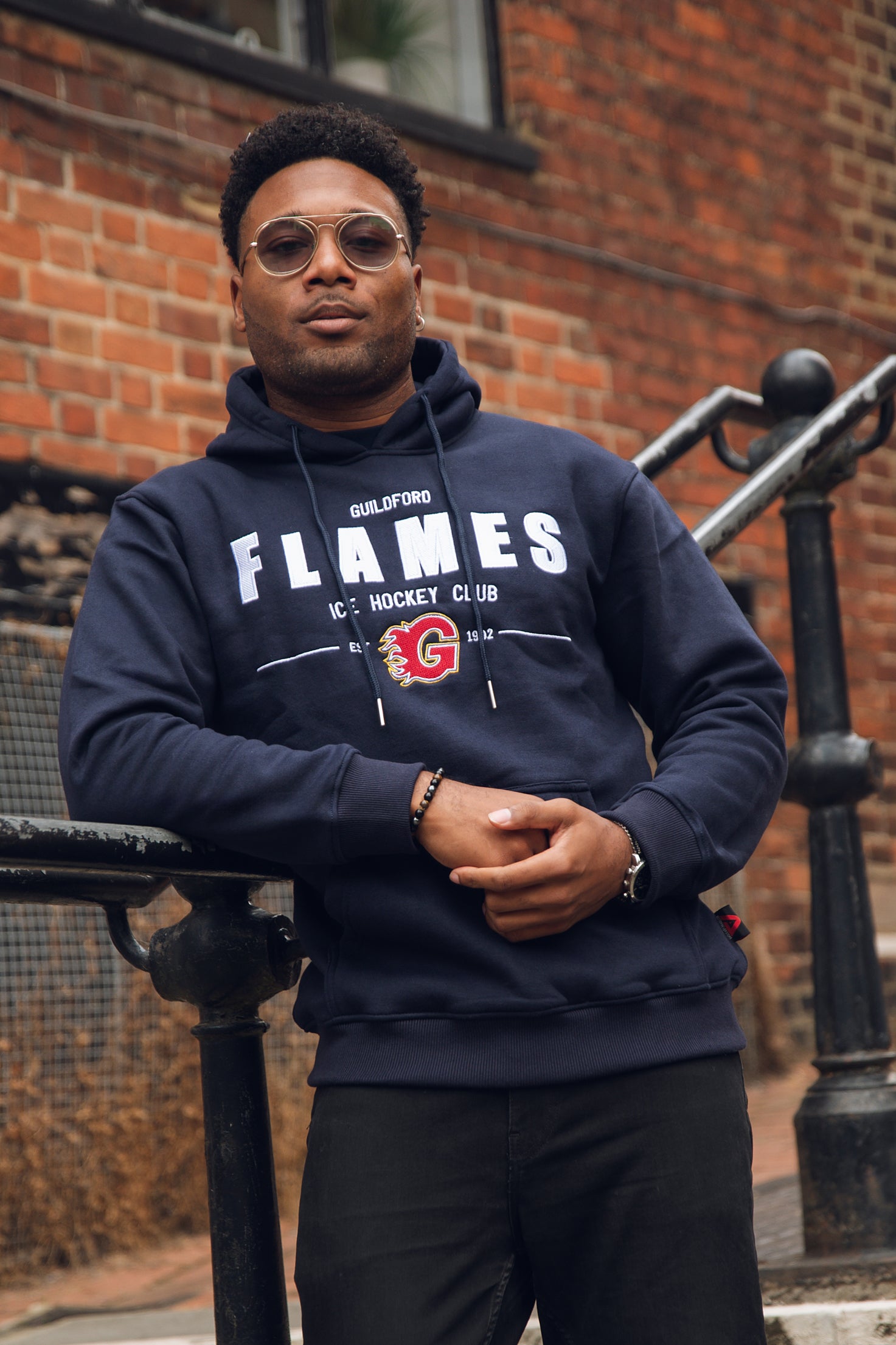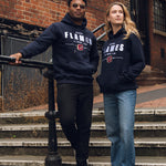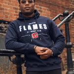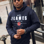 • Navy hoodie with embroidered Flames text & crest